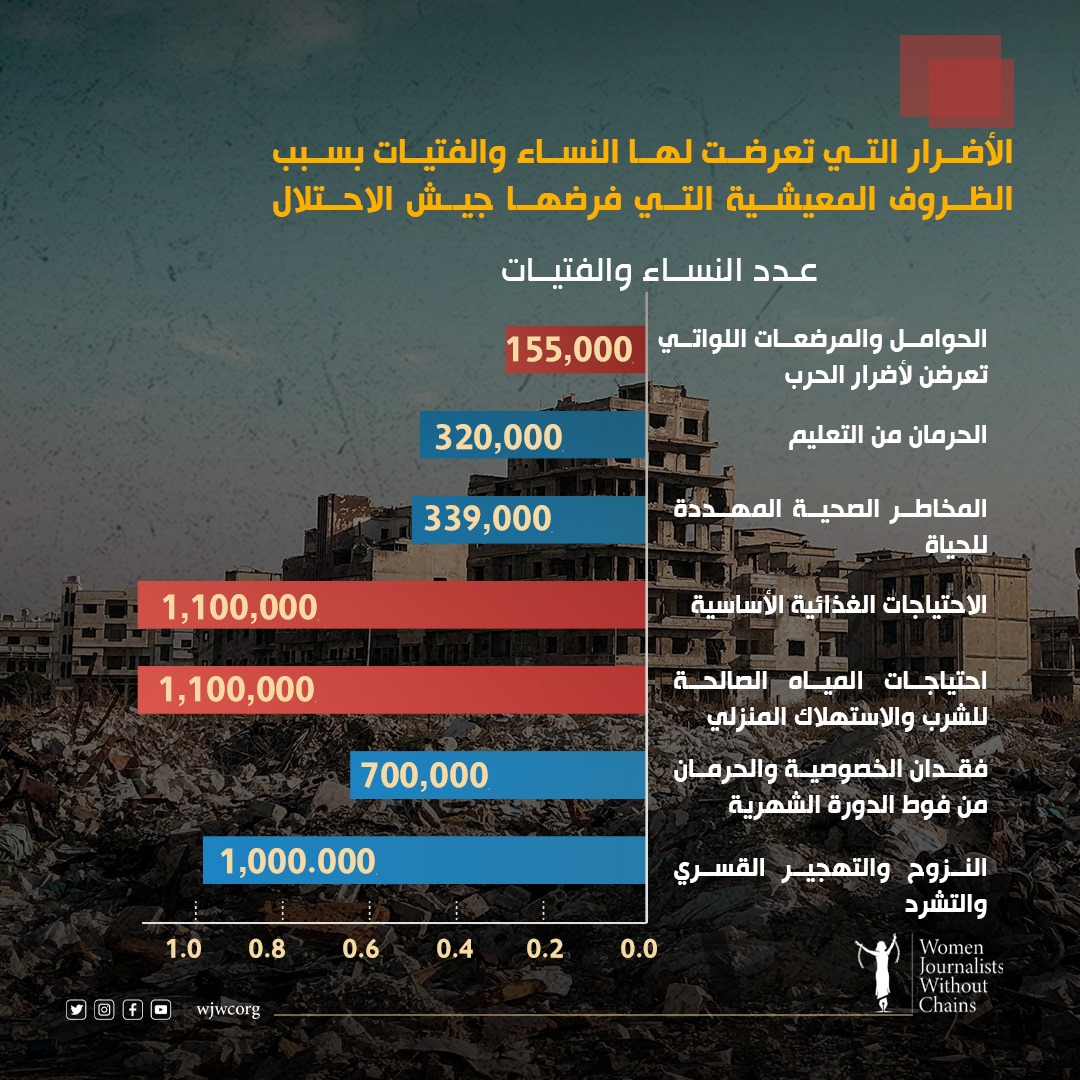 وقالت صحفيات بلا قيود «قُتلت آلاف النساء، وحُرمت مئات الآلاف من النساء والفتيات في فترة الحيض من أبسط خصوصياتهن: مستلزمات النظافة الشخصية المتعلقة بالدور الشهرية، ودخول دورة المياه» كما وجدت مؤشرات خطيرة لتكتيك غير قانوني تستخدمه إسرائيل لاستهداف الحوامل والمرضعات، والنساء اللواتي يعانين من مشاكل الإنجاب في قطاع غزة.