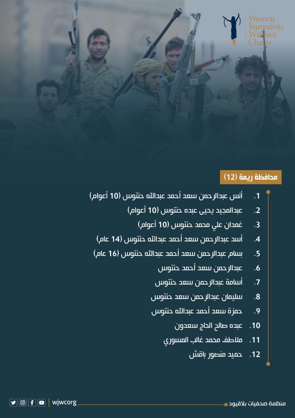 مطلع يوليو 2025، شهدت محافظة ريمة جريمة مروعة، عندما شنت مليشيا الحوثي حصاراً مطبقاً على قرية المعذب، بمديرية السلفية باستخدام عشرات العربات العسكرية ومئات الجنود، تمهيداً لهجوم واسع على منزل الشيخ صالح حنتوس. خلال الهجوم، استخدمت المليشيا أسلحة ثقيلة ومتوسطة، ما أسفر عن مقتل الشيخ حنتوس وإصابة زوجته ووالدتها إصابات بالغة، في جريمة مروعة وصفتها المنظمة بجريمة حرب مكتملة الاركان.