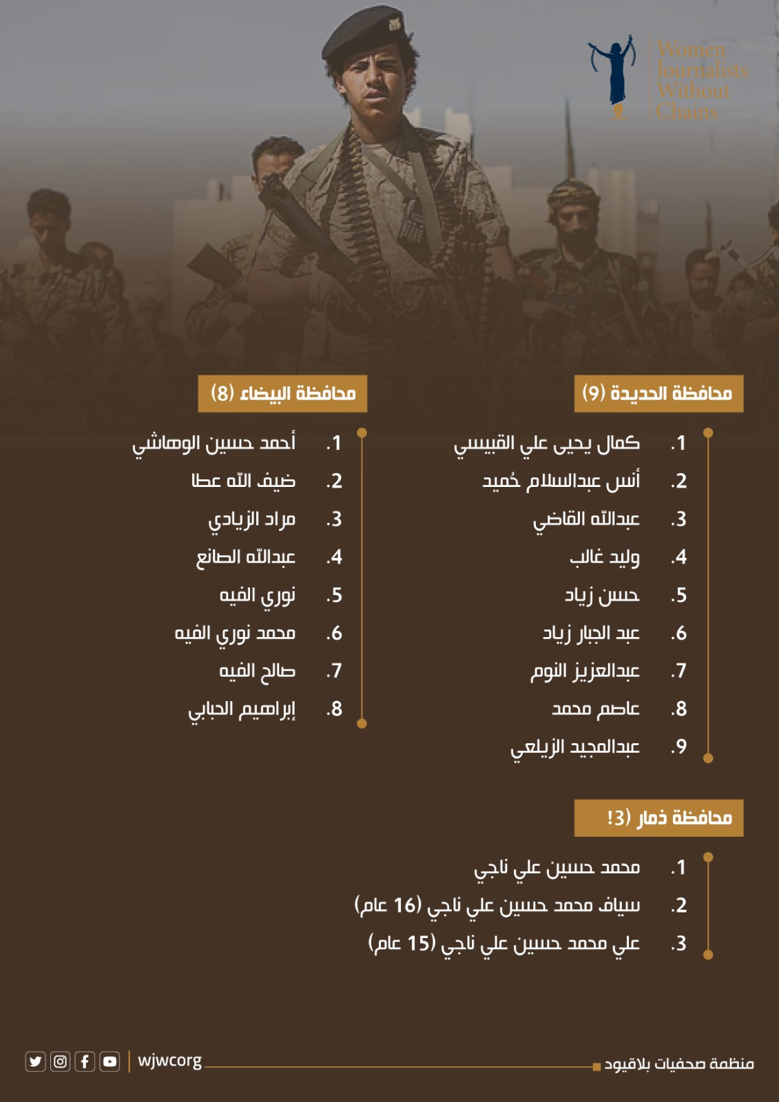 وفي إطار جهودها في الرصد والتوثيق، أكدت منظمة صحفيات بلا قيود أنها وثقت قائمة تضم (186) مختطفاً اختطفتهم مليشيا الحوثي خلال الفترة من مايو وحتى أغسطس 2025 في سبع محافظات على النحو الآتي: إب (110)، تعز (25)، صنعاء (19)، ريمة (12)، الحديدة (9)، البيضاء (8)، وذمار (3).