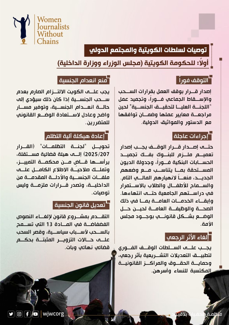 حذّرت منظمة صحفيات بلاقيود من أن الكويت تشهد منذ مطلع عام 2024 واحدة من أخطر أزمات المواطنة في تاريخها الحديث، بعد تنفيذ حملة واسعة النطاق لسحب وإسقاط الجنسية طالت أكثر من 50 ألف شخص حتى أغسطس/آب 2025، أي ما يعادل 3.33% من إجمالي عدد المواطنين الكويتيين البالغ نحو 1.5 مليون نسمة.